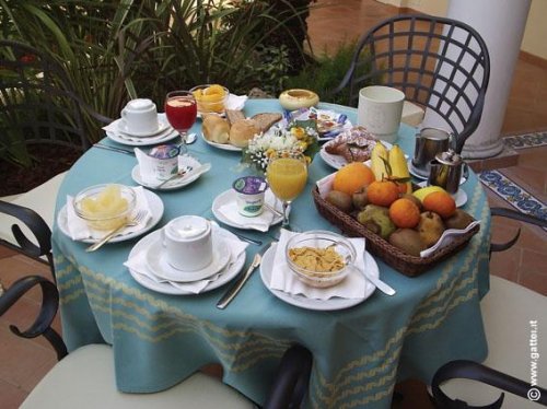 Das Frühstücksbuffet wird in einem üppig bepflanzten Garten serviert.