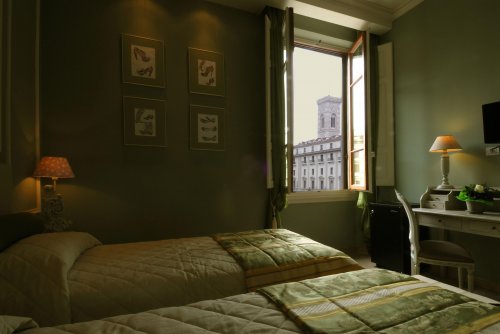 Alle unsere Zimmer sind mit zeitgemäßem und funktionalem Komfort bestückt, einige öffnen sich auch mit einer bezaubernden Sicht auf den "Cupolone", die Domkuppel von Brunelleschi, und den Campanile di Giotto.