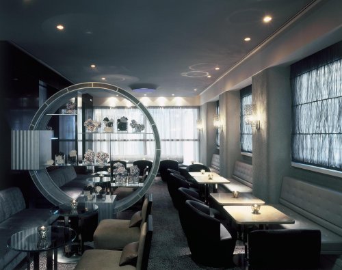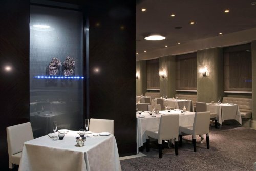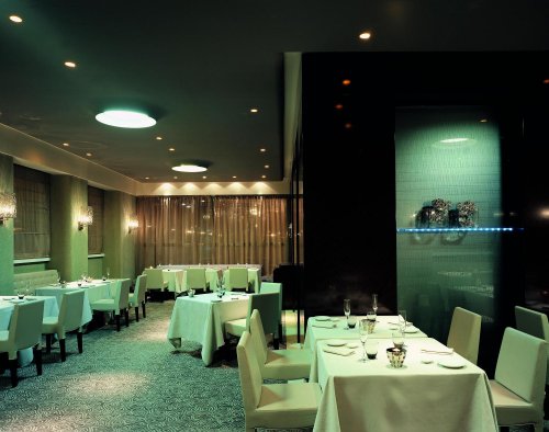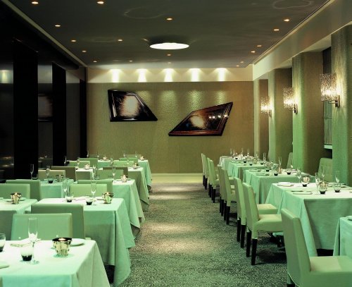 Das Restaurant, das sich in dem der Lounge Bar entgegen gesetzten Flügel befindet, bietet ein essentielles Ambiente, das mit anspruchsvollen Materialien und Ausstattungen bereichert ist, wie beispielsweise Tapeten mit mikroskopisch kleinen Glaskugeln in Gold- und Silbertönen, Tai Ping- Böden und die Palisandertüren. Auch die bequemen, einhüllenden Polsterstühle glitzern dank der metallischen Reflexe der Gewebe.