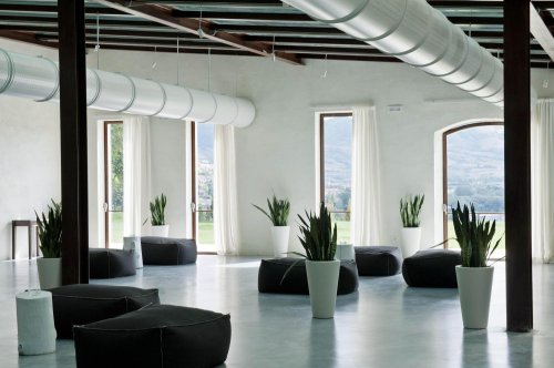 Gli ospiti vengono accolti in un edificio imponente dove protagonisti sono i materiali quali la pietra antica, il legno, le pareti trattate con la cera d'api come si faceva anticamente, e poi la luce e il verde tutto intorno, un dialogo continuo tra l'interno e l'esterno attraverso le grandi vetrate.