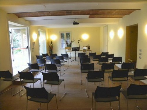 Im Tagungsraum des Hauses finden bis zu 70 Personen Platz. Der Raum ist mit Audio- und Videotechnik sowie einer Leinwand ausgestattet.