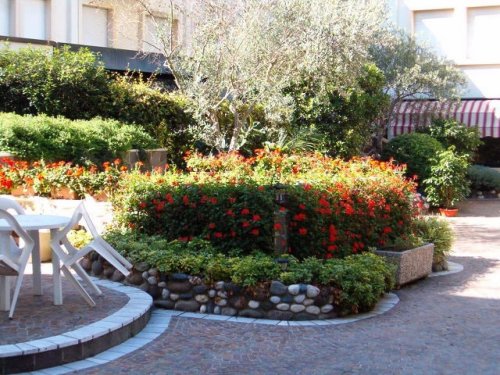 Wie eine Art moderner „Kreuzgang“ umschließt das Hotel einen herrlichen, üppigen Garten mit zwei Brunnen und drei Olivenbäumen.