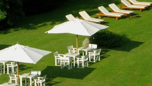 Eingebettet in das Grün des Parks liegt der neue Privatpool des Hauses. Dieser verfügt über einen Warmwasserbereich (30° C), verschiedene Massagedüsen, Umkleidekabinen und eine Sonnenterrasse.