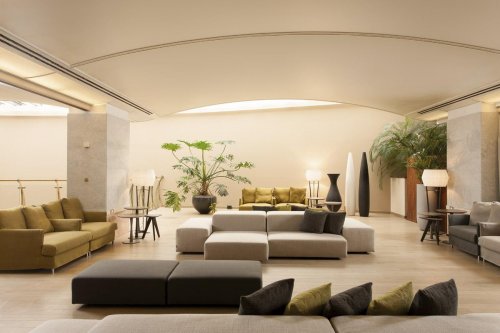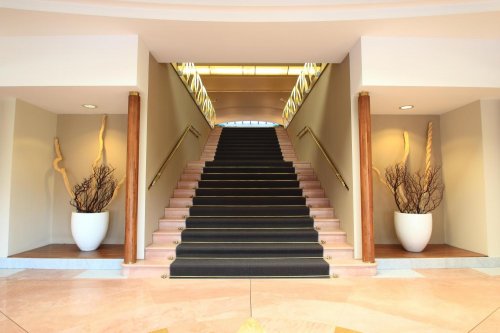 Eine breite Marmortreppe führt von der Empfangshalle in den gemütlichen Saal des „Monte Grand Café“, in dem Kunstbücher, Zeitungen und angenehme Hintergrundmusik zu einer herrlichen Atmosphäre beitragen.