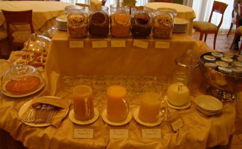 Morgens wird im Speiseraum ein köstliches kontinentales Frühstücksbuffet, unter anderem mit traditionellen Produkten der Region, serviert.
