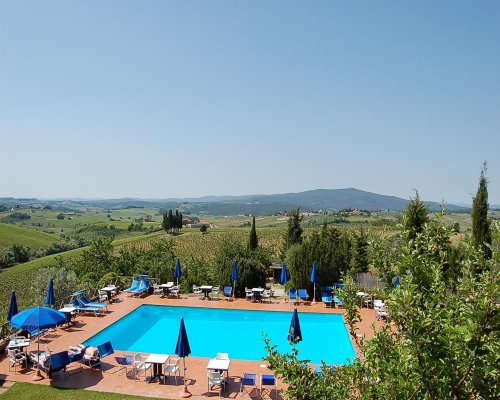 In den Gärten findet sich ein bezaubernder Pool mit Blick auf die Weinberge des Chianti und die Farbenpracht des Valle d'Elsa.