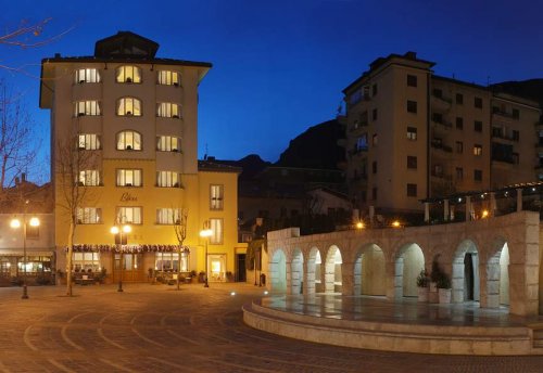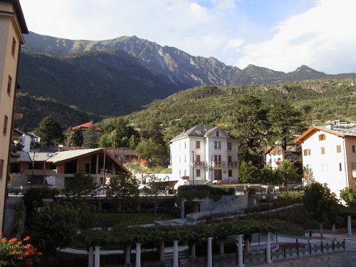 Das Hotel Bijou geht auf den Platz des historischen Zentrums von Saint-Vincent hinaus und bietet einen herrlichen Ausblick auf die Gärten und die umliegenden Berge.