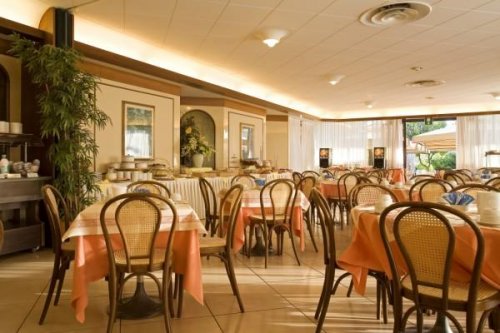 Das Hotelrestaurant liegt mitten im Grünen des Parks mit Blick auf das Schwimmbad und bieten mittags ein Buffet, abends das Essen am Tisch an.