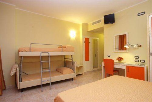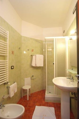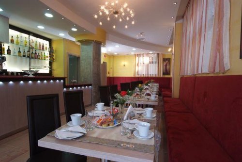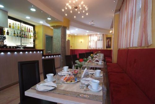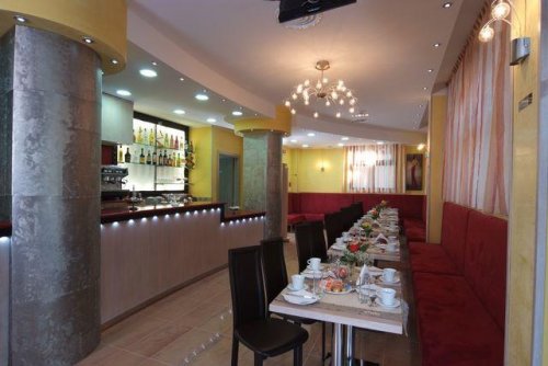 Neben der Empfangshalle findet sich eine Bar mit kleinem Speiseraum, in dem morgens ein üppiges italienisches Frühstück serviert wird.