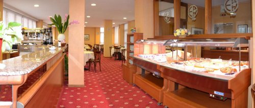 Im hellen Speisesaal mit Blick auf Garten und Pool wird morgens ein üppiges Frühstücksbuffet serviert.