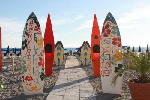 Der nur 50 Meter entfernte Sand- und Kieselstrand ist vom Park aus über eine Unterführung erreichbar.