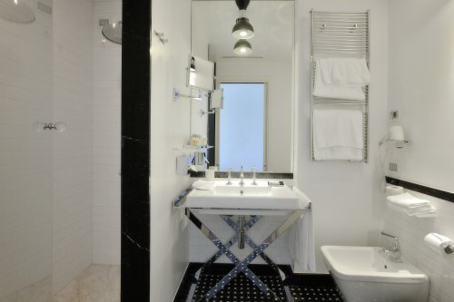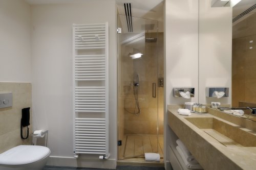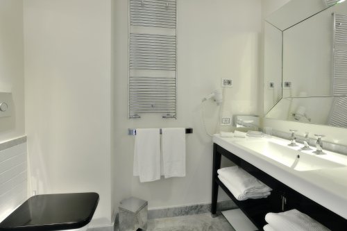 Geräumige Zimmer mit Terrasse (mit Sitzgelegenheiten), LCD-Fernseher, Sat-TV, kabellosem Internetzugang, Minibar, Zimmersafe und eigenem Bad in Marmor mit Dusche.