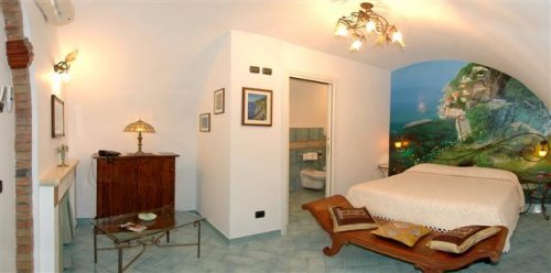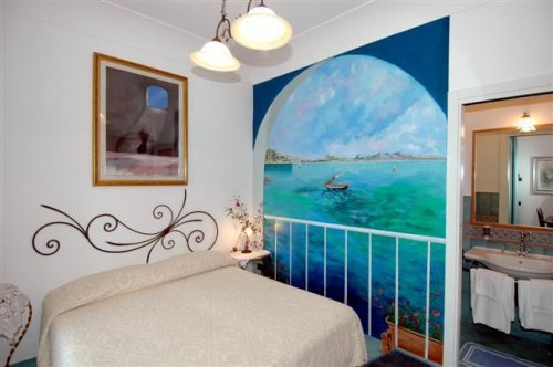 - Doppelzimmer des Typs Standard (ohne Meerblick), mit eigenen Badezimmern und mit Fresken verzierten Wänden.