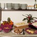 Das Frühstücksbuffet kann mit süßen und salzigen Speisen aufwarten und wird im Frühstücksraum aufgetragen.