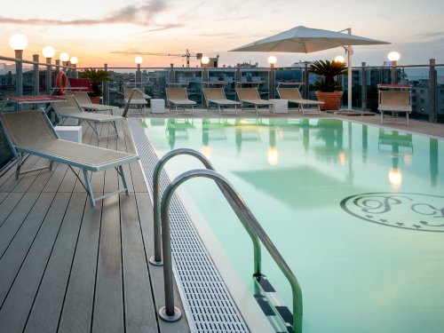 Vom Hotelpool genießen Gäste einen atemberaubenden Ausblick auf den Strand von Rimini.