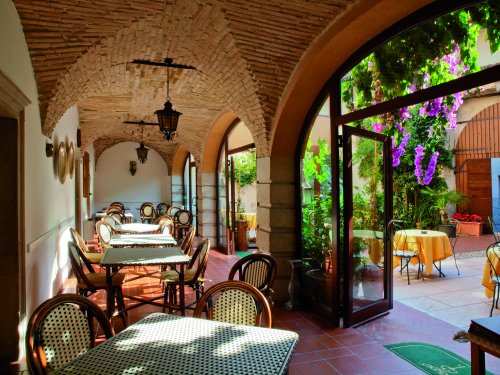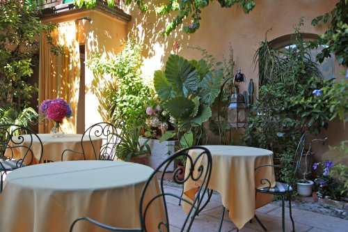 Das Frühstück am Buffet wird Ihnen auf der sonnigen Veranda aufgetragen, die auf den Garten mit seiner reichen Vegetation und den Pool hinausgeht. Zu Abend speisen Sie hingegen in der schönen Jahreszeit im malerischen Bogengang und im Innenhof.
