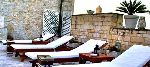 Eine alte steinerne Kriegermaske aus dem 2. Jahrhundert vor Christus und die Überreste eines antiken Stadttors zieren den bezaubernden Speisesaal.