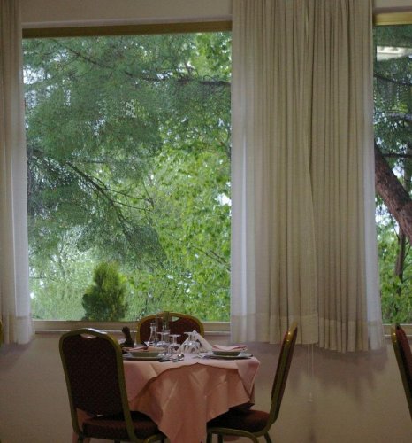 Im kleinen Speiseraum mit herrlichem Ausblick wird morgens ein üppiges Frühstück mit hausgemachten süßen Speisen serviert.