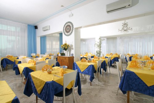 Im hellen Speisesaal des Hotels finden bis zu 130 Personen Platz. Zum Frühstück wird ein reichhaltiges Buffet serviert.