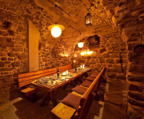 Das Restaurant bietet typisch regionale und internationale Gerichte sowie eine Auswahl erlesener Weine aus der örtlichen Kellerei.