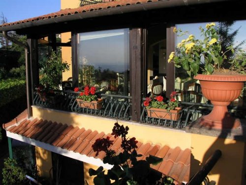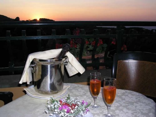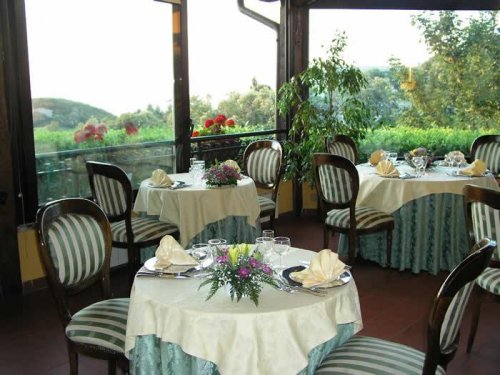 Eine Veranda mit fabelhaftem Ausblick, eine kleine Taverne im Grünen und ein schattiger Garten mit Kastanienbäumen tragen zu dem einzigartigen Charme der Location bei.