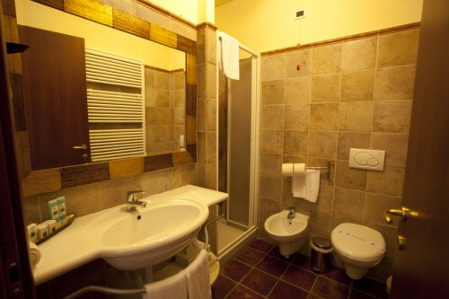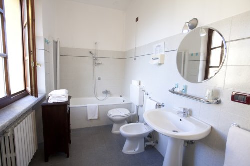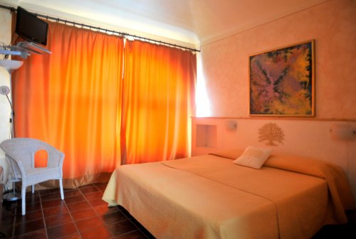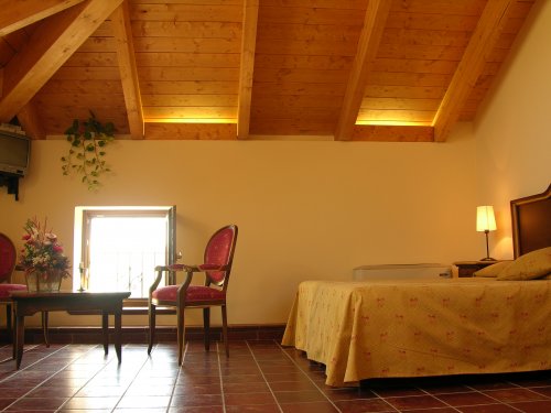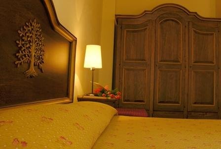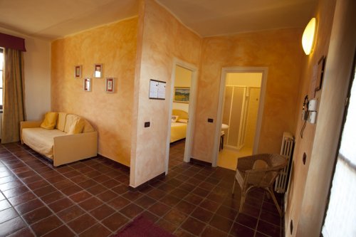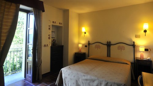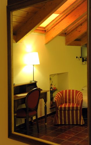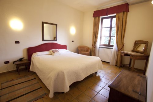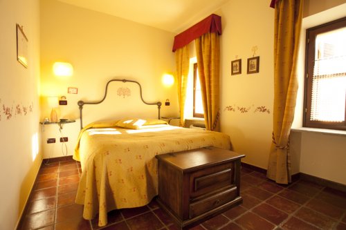 Le camere al primo piano dell'edificio principale, arredate nelle tonalità del giallo e del rosso, dispongono di vista panoramica sulle colline oppure sul giardino interno.