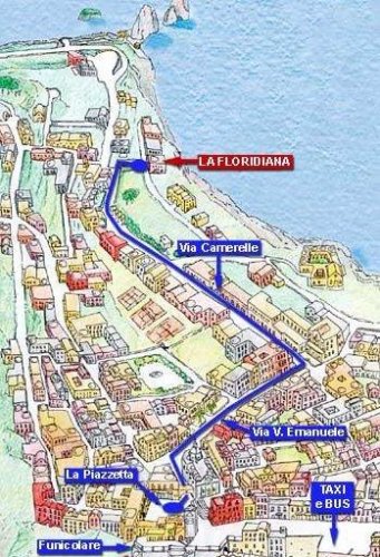 Am Hafen Marina Grande steht die Seilbahn (Fahrzeit 3 Minuten, Preis 1,30 € pro Person), oder das Taxi (10 Minuten, etwa 12 €) zur Piazzetta zur Verfügung. Von der Piazzetta aus kann man nur zu Fuß durch die wichtigsten Shopping- Strassen Via Vittorio Emanuele und dann Via Camerelle weitergehen. Am Ende der Via Camerelle der Beschilderung zum Hotel La Floridiana abwärts folgen. Das Hotel liegt etwa 30 m weiter, wenige Stufen tiefer.