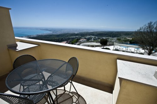 - Junior Suite, bestehend aus einem Schlafzimmer mit Schlafcouch und Doppelbett, Bad und Panoramaterrasse mit Blick auf den Golf von Manfredonia und aud den Pool.
