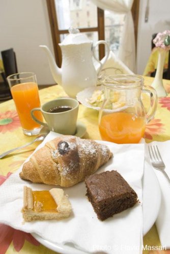 Das Frühstück umfasst warme Croissants, Kuchen, Joghurt, Butter, Marmelade, Säfte, frisches Obst sowie heiße Getränke und wird von 08:00 bis 11:00 Uhr im Speiseraum oder im Zimmer serviert. Auf Anfrage sind auch salzige Speisen erhältlich.