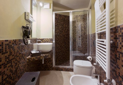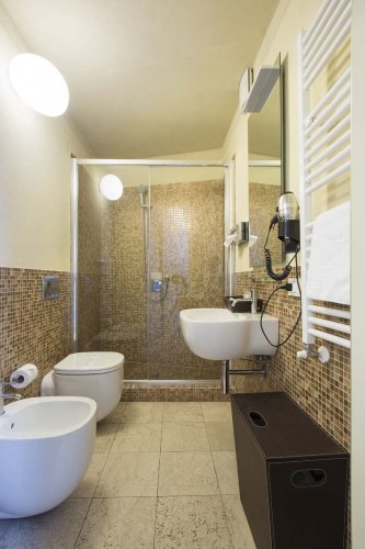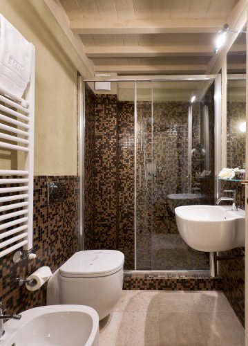 Stile ed eleganza sono il binomio che contraddistingue tutte le camere: mobili ricercati ed essenziali, pavimenti in parquet e bagni in prezioso mosaico color rame e argento.