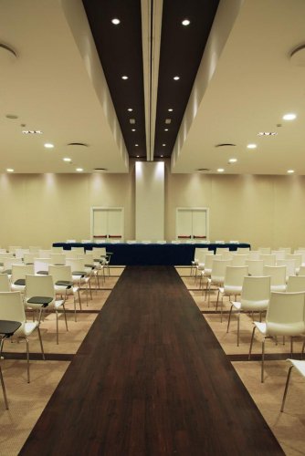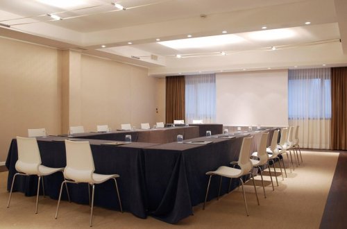 Lit with natural lighting, the rooms have a sound system with microphones and cordless microphones, an overhead projector, a flip chart, a projection screen, a slide projector, a video projector, teleconference equipment, video conference equipment, a laser pointer, simultaneous translation services, and audio and video recording equipment.