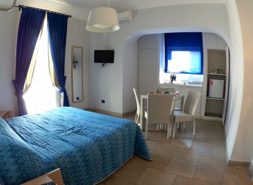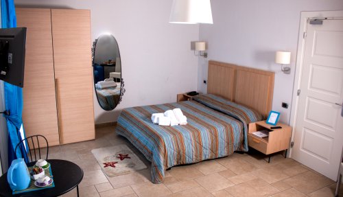 Ogni camera si caratterizza per le tonalità dei suoi piccoli mosaici, dal blu al rosso passando dall'arancio al giallo. Sono tutte con vista mare e dotate di servizi privati con doccia.