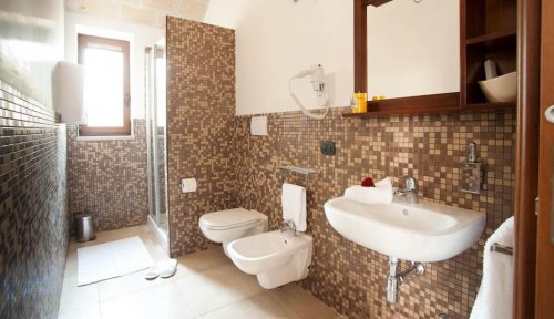 La Suite "Cielo" di Masseria Borgo Ritella con terrazza vista mare propone ampi spazi ed elementi esclusivi con spaziosa doccia idromassaggio.