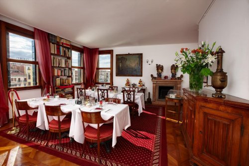 Guests have access to an elegant living area, a breakfast room with a charming view of the Grande Canal, and a luxurious private library with numerous books about architecture and art.