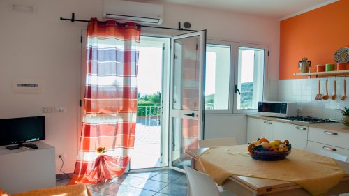 Il Bilocale è adatto a un massimo di 3 persone ed è composto da una camera matrimoniale, 1 soggiorno con divano letto e angolo cottura, un bagno con doccia e due terrazze.