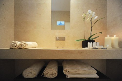 Guests have access to a heated outdoor swimming pool with salt water, a wellness centre with three thermal baths, a Turkish bath, a relaxation area and a sunbathing area, a gym, a lovely green garden, laundry service and an indoor parking garage.