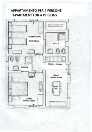 L'appartamento per 4 persone è composto da 1 camera matrimoniale con bagno privato, 1 camera doppia (con 2 letti singoli) con bagno privato, tinello con cucina attrezzata.
