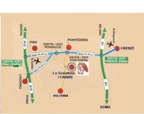Alla rotonda seguire le indicazioni per Volterra e dopo circa 4 km (al 2° rondò) seguire le indicazioni per I Fabbri, finita la località I Fabbri, girare subito a sinistra per Via Vecchia Palaiese; proseguire poi per Via di Valle seguendo le indicazioni della struttura.