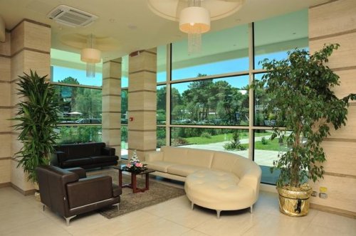All of the guest rooms have a balcony overlooking the sea or the pine forest, and are equipped with a telephone, satellite colour television, a safety deposit box, and an en suite bathroom with a bathtub or shower and a hairdryer.