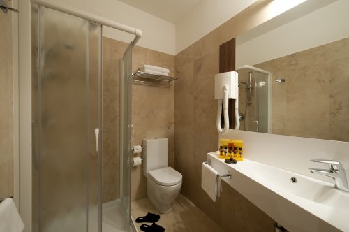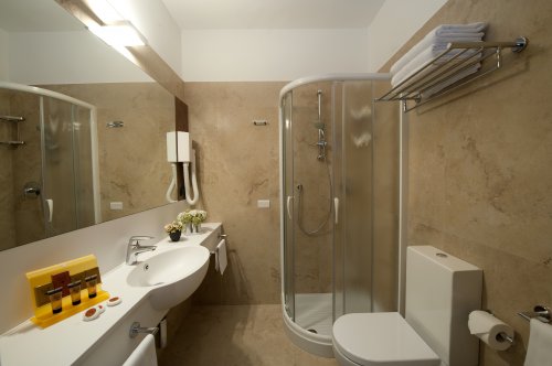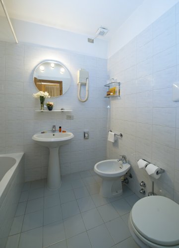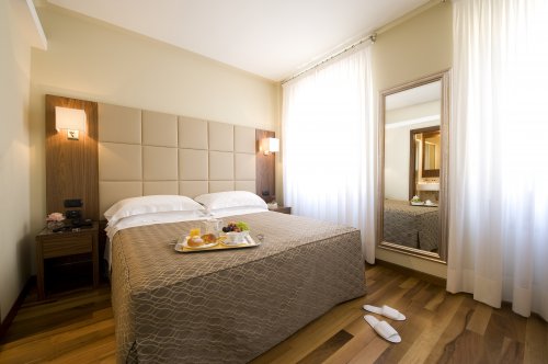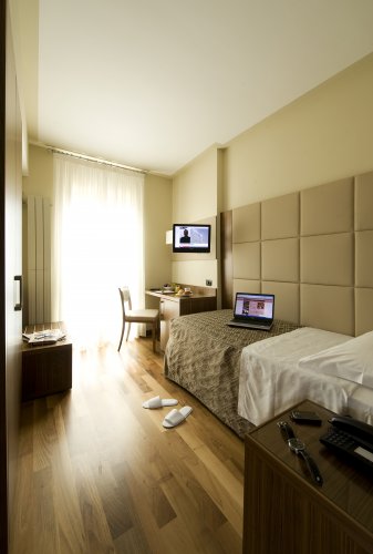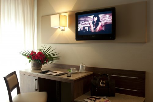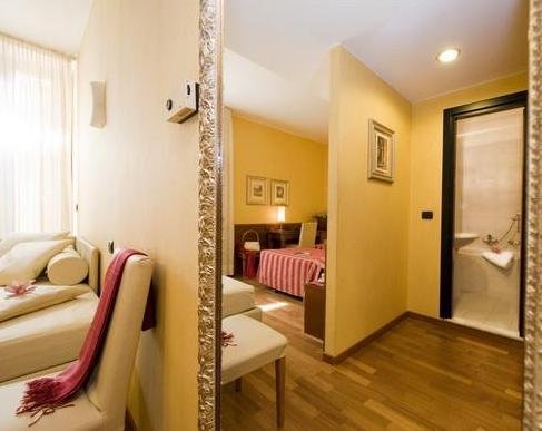The hotel has welcoming and comfortable rooms furnished in a modern style with parquet flooring, furniture made from pear or cherry wood, air conditioning, a direct dial telephone, a minibar, a satellite colour television, and an en suite bathroom with a shower stall or bathtub and a hairdryer.