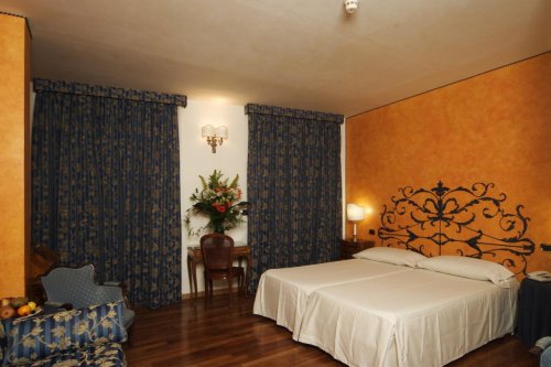 The Standard rooms, with walls decorated in warm shades echoed by the upholstery, have parquet flooring and an en-suite bathroom with a bath and shower.