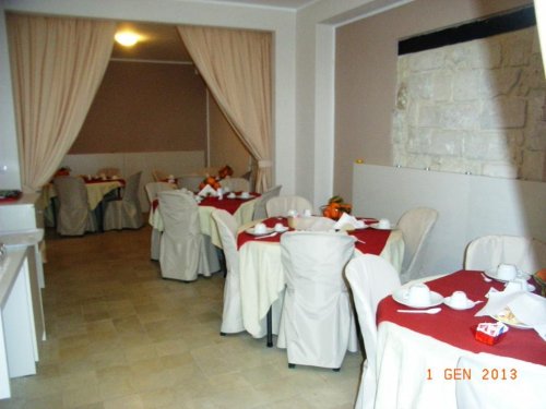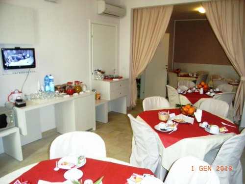 Nell'accogliente Sala colazioni viene allestito al mattino un ricco buffet con caffè, cappuccino, spremuta di arance, cornetto artigianale, marmellate, latte di mandorle.
