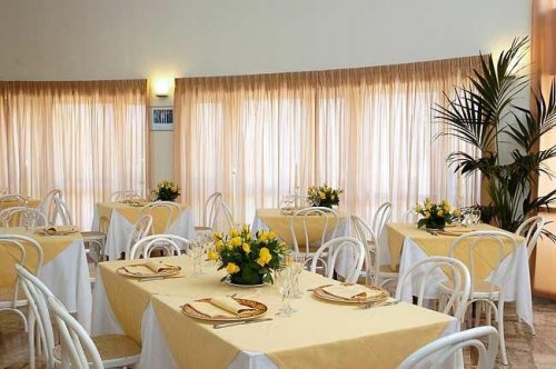 La sala Ristorante si affaccia sulla centralissima Rotonda a Mare e sulla spiaggia della Riviera di Levante.