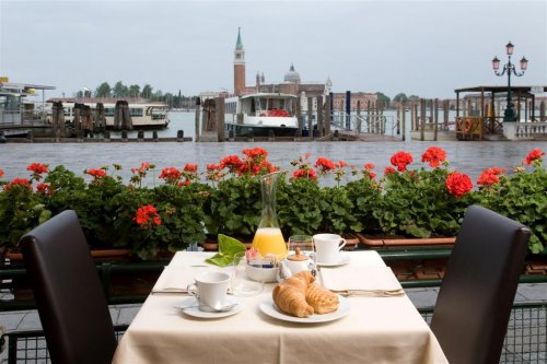 A delicious buffet breakfast is served each morning on the veranda on the ground floor with a view of the lagoon and the island of San Giorgio.