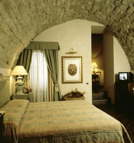 The rooms are decorated with period furnishings and artwork to match the historic building. The Deluxe rooms and Junior Suites have unique medieval characteristics (some with stone arches, others with wooden beams) or a view of the lovely roof garden.