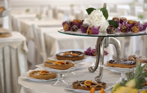 Lunch and dinner include a buffet of cooked and raw vegetables, a choice of five first courses, and a choice of five second courses, meat, fish or vegetarian. A selection of desserts is prepared every day by the chef.