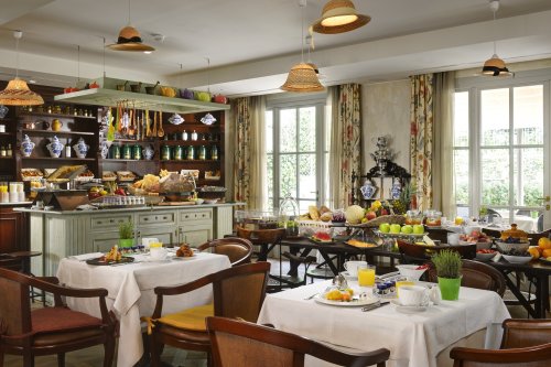 A buffet breakfast is served in the restaurant including croissants, cereals, toast, scrambled eggs marmalade, fresh fruit and yoghurt, cold meats and cheeses, coffee, tea, milk and fruit juices.