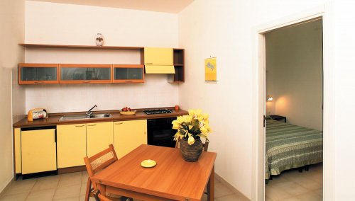- Appartamento da 4 posti letto formato da ampia camera matrimoniale con parete attrezzata ed angolo cottura, un camera con letti a castello, due bagni di cui uno completo di box doccia.