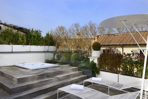 The building has a unique old stone stair case which leads guests to the top floor and the splendid roof terrace where they can sip on a refreshing cocktails and admire the enchanting view over Rome or simply lie back and enjoy the Roman summer sun.