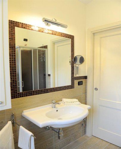The bathroom is decorated with mosaics and includes a washbasin, a bidet and a shower.